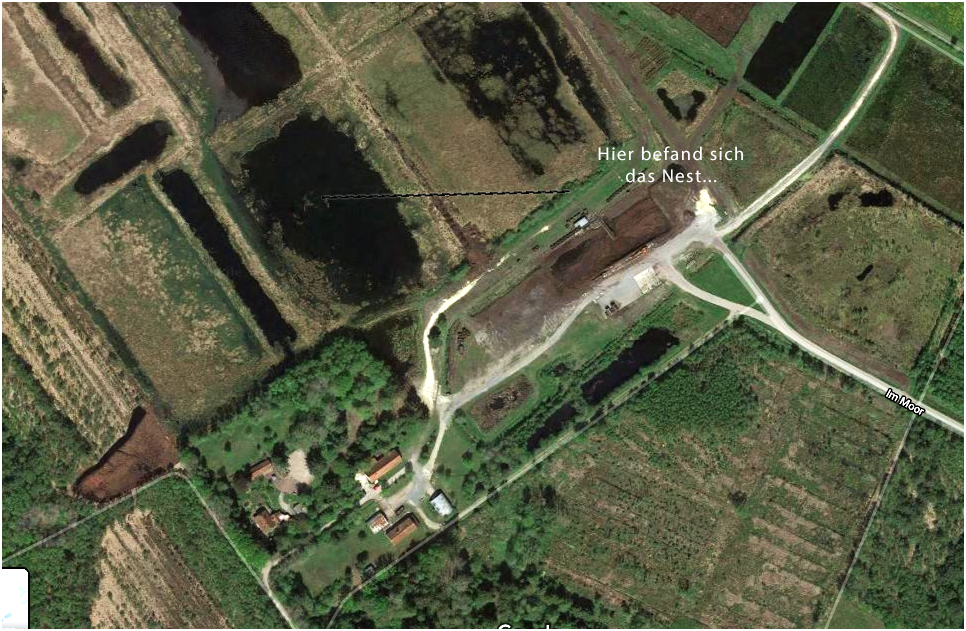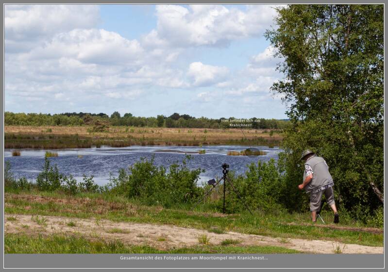Trotz stunden- und tagelanger Fernglassuche gelang es uns zunächst nicht ein Nest zu finden. Wir waren schon ziemlich frustriert und wollten uns schon davon abwenden. Aber da wir die beiden Kraniche bei unseren täglichen Besuchen immer wieder mal sahen, gingen wir auch immer wieder dorthin.